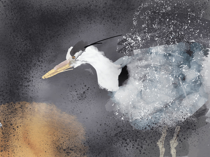 Là, dans la lumière du lampadaire, tel un projecteur sur une scène, le héron au long cou se tenait sur la berge. Alors que j’allais donner le dernier coup de pédale pour traverser le pont en surplomb, je me suis figée autant que lui pour l’observer. Il semblait réfléchir. Et en effet, il avait à la pointe de son bec, une prise qui frétillait. Un chien et un humain passèrent et j’attendais le nez endolori par le froid. Finalement, il se retournera et par un mouvement bref et précis lâcha le poisson pour le gober. Quelques secondes plus tard, il avala à nouveau et je vis son jabot s’arrondir. Et comme pour signifier son contentement, il s’ébouriffa de toutes ses plumes la tête entre les ailes, avec une impression de tableau contemporain vivant fait de rémiges grises, noires et blanches.