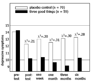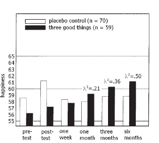 Pour les mesures concernant le « bonheur », les effets bénéfiques des « three good things » augmentent au cours du temps et, inversement, les symptômes dépressifs diminuent. Les chercheurs ont analysé cette augmentation au cours du temps par une adhésion forte à l’exercice : de nombreux participants ont spontanément continué les « three good things ».